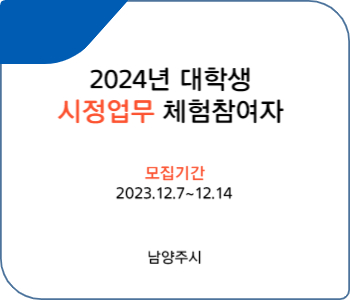 남양주시에서는 공공 일자리 일환으로 동계 대학생 시정 업무 체험 참여자를 모집하고 있으니 관심있는 대학생은 참여 하시기 바랍니다.