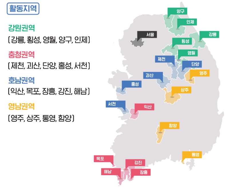 활동지역 : 강원권(강릉, 횡성, 영월, 양구 인제) / 충청권(제천, 괴산, 단양, 홍성, 서천) / 호남권(익산, 목포, 해남, 강진, 장흥) / 영남권(영주, 상주, 통영, 함양) ※4대권역 구분, 1개 권역 선택 이후 권역 내 최대 3개까지 지역 선정하여 지역자원 시행