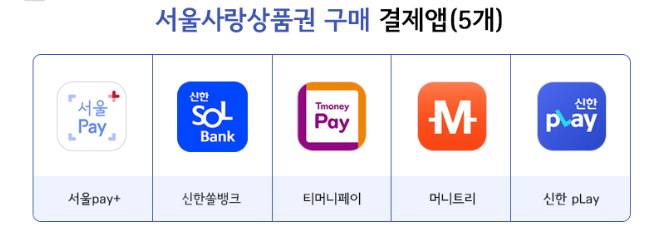 서울사랑상품권은 ‘서울페이플러스(서울pay+)’를 포함해 신한쏠뱅크, 티머니페이, 머니트리, 신한쏠페이 등 5개 앱에서할인된 금액으로 1인당 월 50만 원까지 구매할 수 있으며, 보유 한도는 1인당 150만 원이다.