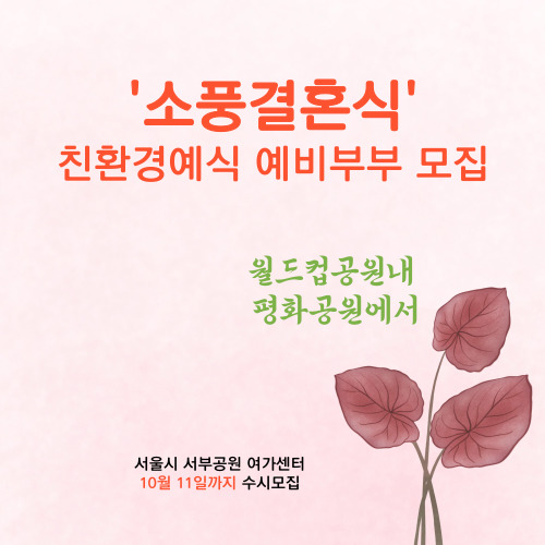 겨울 찬바람이 서서히 물러가고 이제 봄바람 찰랑대며 젊은 청춘 남녀에겐 새로운 가족을 만드는 축복된 결혼 시즌이 시작됩니다.그러나 최근에는 결혼식장 예약부터 비용까지 시간적, 경제적 어려움으로 결혼을 앞둔 예비부부에겐 축복보다는 부담으로 먼저 다가와 때로는 결혼 준비 단계에서부터 갈등으로 이어지는 경우도 있습니다. 예전엔 남들에게 보여주기식의 결혼식 문화였지만 최근 코로나 이후 예전보다 다소 간소화되고 그들만의 뜻있는 결혼식 문화를 추구하는 젊은이들이 많아지고 있습니다. 이에 서울시 서부공원여가센터는 월드컵공원 내 평화의공원에서 친환경 예식 <소풍결혼식>을 올릴 예비부부를 수시로 모집합니다.