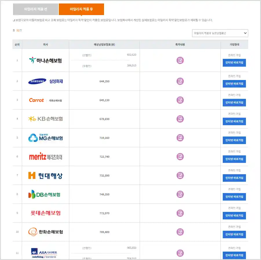 보험료 비교창은 아래와같이 가장 저렴한 보험부터 순차적으로 나오게 되는데, 전부 확인한 후에는 인터넷 바로가입을 클릭하면 해당 보험사 페이지로 이동할 수 있습니다