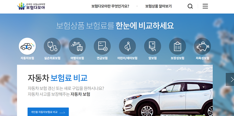 아래는 국내 각 다이렉트 자동차 보험사의 견적을 한데 모아 비교할 수 있는 보험다모아 사이트입니다. 아래를 클릭하시고 순서에 따라 작성 하시면 바로 각각의 보험사 견적을 비교하실 수 있습니다.