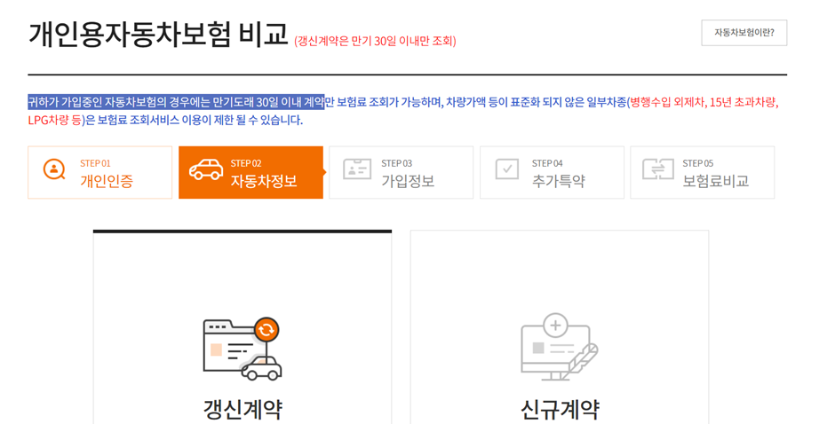 갱신 계약은 1개월 내에 기존 보험이 만기가 될 경우 선택해 주시면 되고, 신규로 새차를 구입하고 가입하는 경우엔 신규 계약을 클릭합니다.