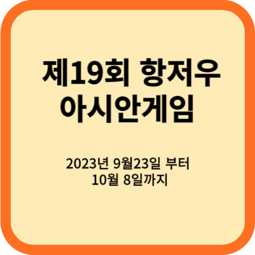 2022년 제19회 항저우 아시안 게임(The 19th Asian Games Hangzhou 2022)이 2022년 9월 23일 개막식을 시작으로 공식 일정에 들어갑니다. "마음이 통하면 미래가 있다"라는 슬로건으로 2022년 항저우 아시안게임은 '중국 신시대·항저우 신아시아운동'을 목표로 '중국 특색·저장 풍채·항저우의 운치·명품'을 내걸고 '녹색·지능·검소·문명'을 지향하며 '항저우 위주, 전 성(省) 공유' 원칙을 고수하고 있습니다. 항저우 아시안게임으로 중국에서는 3번째 아시안 게임을 개최하게 되었습니다.