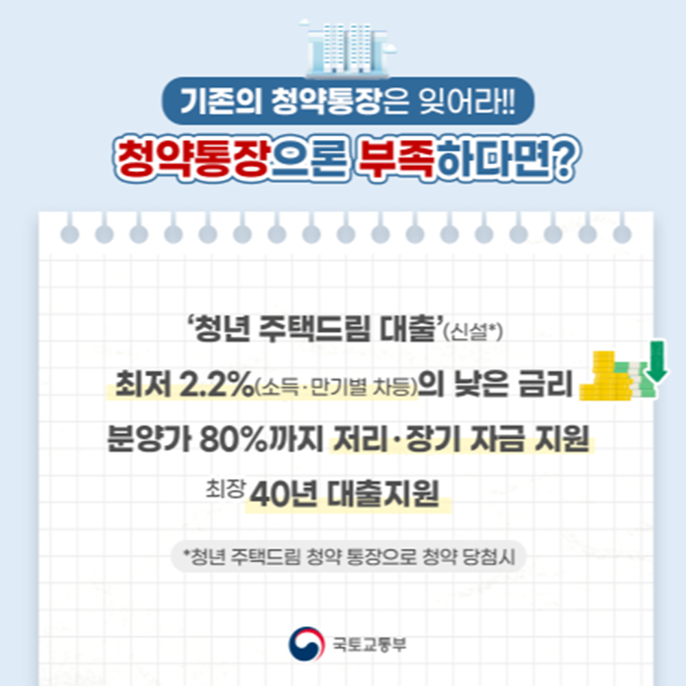 내 집마련은 평생 이루는 하나의 꿈으로, 특히 일반적인 청년의 평생 월급을 10년이상 모두 모아도 서울에서 서민 아파트 한채 가질 수 없다는 것이 현실입니다. 따라서 대한민국 청춘에게 스스로 내집 마련은 커다란 장벽과도 같습니다. 이에 정부가 내놓은 대책은 청년층의 자산형성과 내집 마련을 지원하기 위해, 1년간 청약 통장에 가입하면 2%대의 저리대출을 생애 3단계에 걸쳐 추가 우대하는 획기적인 「청년 내집 마련 1․2․3」 주거지원을 추진한다고 밝혔습니다. 이는 역대 최초로 청약통장과 대출을 연계하여 장기․저리의 대출을 지원할 뿐만 아니라, 결혼․출산․다자녀 등 全생애주기에 걸쳐 추가 혜택을 부여하는 주거지원 방안입니다. 이번 포스팅에서는 청년 주택드림 청약통장에 대해 알아보도록 하겠습니다.