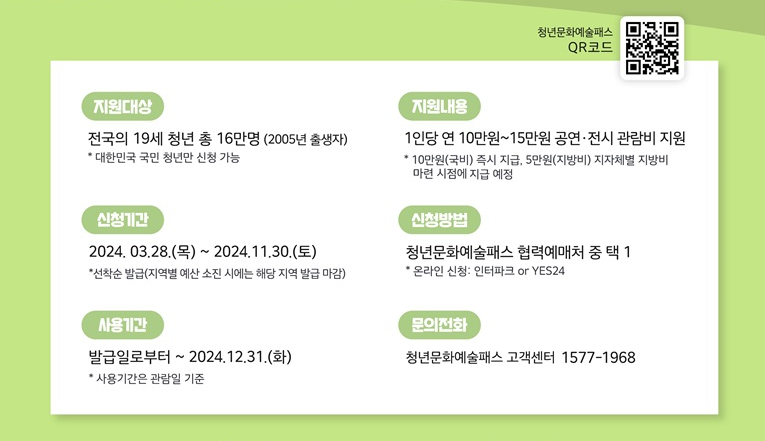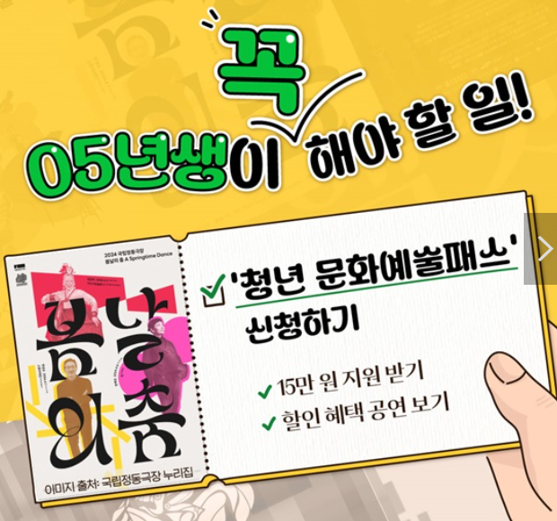 올해 19세가 되는 2005년생 청년은 오는 28일부터 공연•전시 관람비를 1인당 최대 15만원까지 받을 수 있습니다. 문화체육관광부와 한국문화예술위원회는 이날부터 전국 19세 청년 16만여 명을 대상으로 공연•전시관람에 사용할 수 있는 청년문화예술패스를 발급한다고 20일 밝혔습니다. 성년을 맞이한 2005년생 여러분, 공연·전시 관람비 최대 15만원 ‘청년 문화예술패스’ 신청하고 ‘청년 문화예술패스’ 이용자에게 주어지는 공연 할인 혜택까지 꼭꼭 챙기시고 문화생활 제대로 즐겨보시죠! ‘청년 문화예술패스’는 소득과 관계없이 국내에 거주하는 2005년생 대한민국 청년이라면 누구나 신청할 수 있는 이용권으로 전국 17개 시도별로 정해진 청년 수에 따라 28일 오전 10시부터 신청순으로 발급합니다.