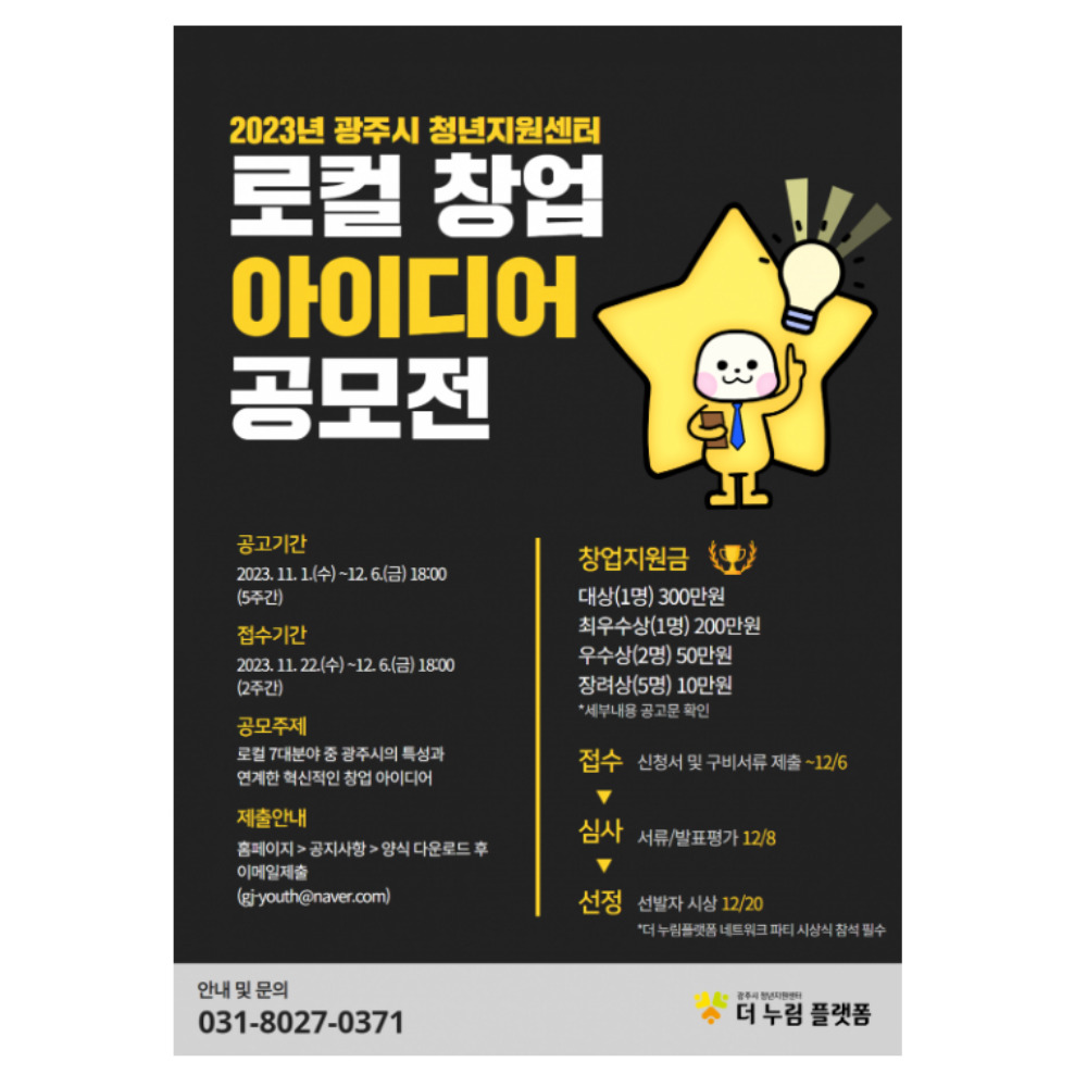 경기도 광주시 청년지원센터에서는 지역 자원과 산업을 활용한 혁신적인 아이디어를 가진 우수한 로컬 콘텐츠를 발굴하여 지역경제 활성화를 도모하기 위하여 「2023년 로컬 창업 아이디어 공모전」 참가자 모집을 다음과 같이 공고합니다. 로컬 7대 분야중 광주시의 특성과 연계한 혁신적인 비즈니스 모델을 접목하여 지역문제를 해결하고 새로운 가치를 창출하는 사업·아이템을 주제로 광주시 초기 차업자 대상으로 2023년 11월 22일부터 12월 6일까지 2주간 접수를 진행하니 대상 창업자분께서는 아이디어 공모전에 참여하여 창업 지원금을 받을 수 있기를 바랍니다.