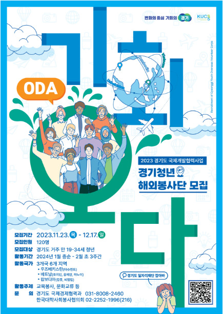 경기청년 해외봉사단 '기회오다(ODA)'는 경기도 청년사다리 해외봉사 부문으로, 개발도상국의 교육현장에서 현지 청소년과 소통하는 교육봉사와 현지인들과 문화교류 경험을 동시에 할 수 있는 기회를 제공하기 위하여 참여자를 모집합니다. 해외봉사에 관심 있으신 분들은 지금 현재 모집 중이니 참여 신청 하시기 바랍니다.