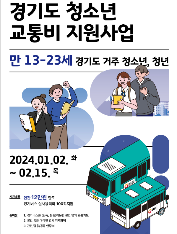 오늘은 경기도에서 진행하고 있는 "경기도 청소년 교통비 지원 사업"에 대해 알아보도록 하겠습니다. 대중교통 이용 빈도는 높지만 경제적으로 취약한 청소년들의 교통비 부담 완화에 목적을 두고 경기도에 거주하는 13세~23세 청소년을 위하여 추진하고 있습니다. 2023년1월1일부터 2023년12월31일까지 실제 사용한 교통비 이용 내역을 확인하여 지역화폐로 환급하고 있으며 경기 버스 단독 또는 연계된 환승 통행 교통비에 대하여 연간 최대 12만원(반기별 6만원) 한도로 지원하고 있습니다. 2024년 1월 2일(화)부터 2월 15일(목)까지 경기도 청소년 교통비 지원 포털(인터넷, 모바일)을 통하여 진행되니 많은 신청 바랍니다.