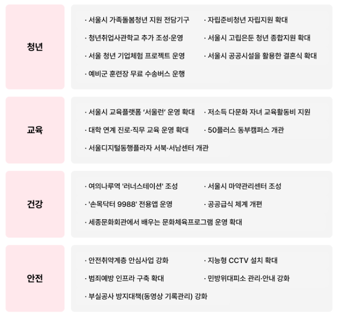 이상동기범죄 등으로부터 안심하고 생활할 수 있도록 112 즉각 신고가 가능한 ‘휴대용 SOS 비상벨’과 ‘안심경보기’ 세트를 지급하고 야간 순찰을 책임지는 ‘안심마을보안관’ 전 자치구 확대, ‘안심이 앱’ 기능 추가 등 늦은 밤길 시민의 안전한 귀가를 돕는다. 무차별 범죄로부터 시민을 보호하기 위해 쓰러짐·폭행 등을 자동 탐지하는 ‘지능형 CCTV 설치’도 확대한다. 빅데이터 분석을 통해 발굴한 공원·등산로, 주거·상업지 등 안전사각지역에 CCTV를 설치하고 내구연한이 경과한 CCTV는 200만 화소 이상으로 교체한다. ‘부실시공 없는 안전한 서울’을 만들기 위해 1월부터 서울 시내 모든 공사장을 대상으로 ‘동영상 기록관리’를 확대한다. 민간 공사장의 경우, 건축허가(사업승인) 대상인 모든 건축물에 대해 주요 공종(철근배근, 콘크리트 타설 등)의 동영상 기록관리를 의무화한다.