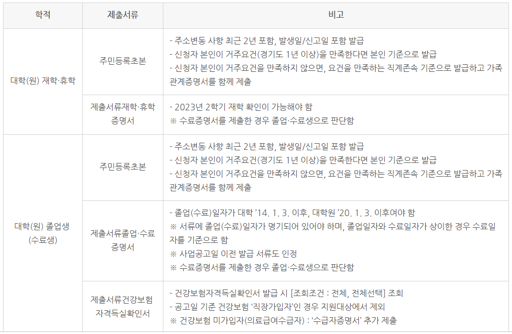 - 대학 졸업·수료 후 10년(2014. 1. 3. 이후 졸업)까지, 대학원 졸업·수료 후 4년(2020. 1. 3. 이후 졸업)까지 지원