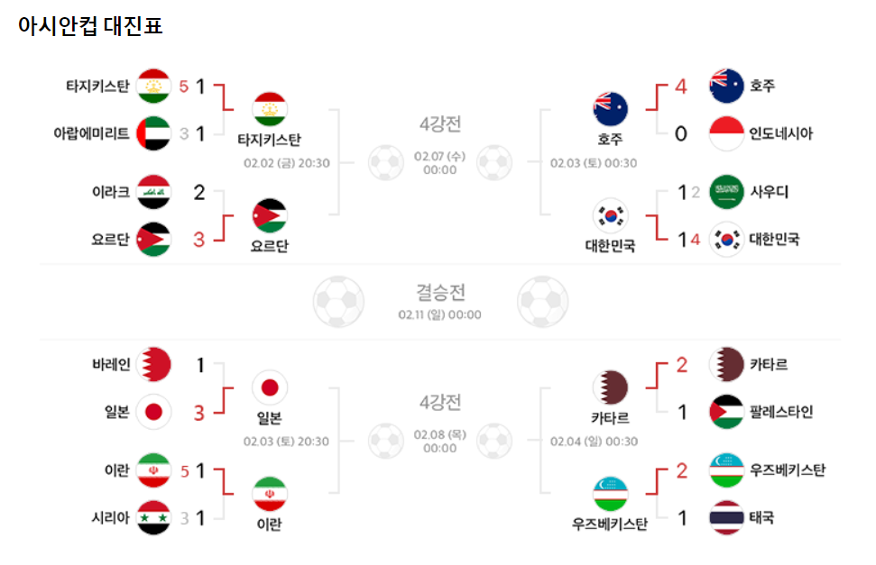 이란, 일본과 함께 한국, 호주 등 우승 후보 4팀이 모두 8강에 진출했다. 하지만 이 중 절반은 곧 짐을 싼다. 이란-일본의 8강전에 앞서 한국과 호주가 3일 오전0시 30분 알와크라 알자누브 스타디움에서 또 다른 8강전을 벌인다. 한편 또 다른 8강 진출팀 타지키스탄과 요르단은 2일 오후8시 30분 알라얀 아흐마드 빈 알리 스타디움에서 맞붙고, 카타르와 우즈베키스탄은 4일 오전0시 30분 알코르 알바이트 스타디움에서 4강에 도전한다.