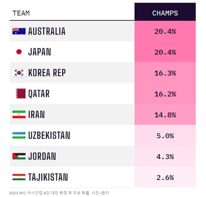 2023 아시아축구연맹(AFC) 아시안컵 8강 대진이 확정됐다. 대진 등을 고려한 새 우승 확률도공개됐다. 한국이 아시아 최강 자리에 오를 가능성은 16.3%. 8강에 오른 팀들 가운데 세 번째다. 축구 통계 업체 옵타는 1일(한국시간) 아시안컵 8강 대진이 최종 확정된 뒤 참가팀들의 새 우승 확률을 공개했다. 한국은 16.3%로 호주와 일본(이상 20.4%)에 이어 3위에 올랐다. 개최국 카타르가 16.2%로 한국에 0.1% 포인트 뒤진 4위, 이란은 14.8%로 5위다. 우즈베키스탄(5%)과 요르단(4.3%) 타지키스탄(2.6%)은 한 자릿수에 그쳤다. 당장 오는 3일 오전 0시 30분(한국시간) 카타르 알와크라의 알자누브 스타디움에서 열리는 호주와 8강전부터 이른바 ‘언더독’으로 분류됐다. 옵타는 호주가 4강에 오를 확률은 54%로, 한국은 46%로 각각 책정했다. 한국이 이번 대회에서 열세에 몰린 건 이번이 처음이다.